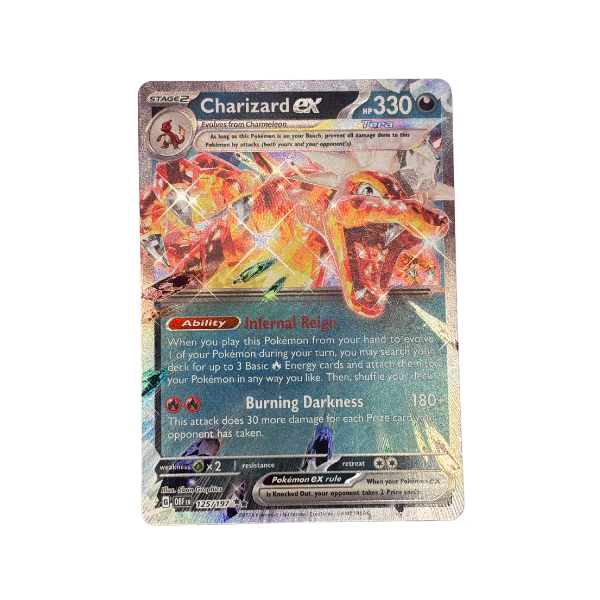 Released in 2023 within the Scarlet & Violet Obsidian Flames set, this Charizard ex (#125/197) is an English Ultra Rare featuring the Infernal Reign ability. A core Charizard card from Obsidian Flames and a key piece for collectors of the set.